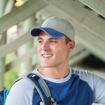 Adams Optimum Stone-Crown With Contrast Bill. Adams pigment dyed, garment washed, low profile, six panel, unstructured, 100% cotton cap with leather strap, antique brass buckle, four rows of stitching on self-fabric sweatband, sewn eyelets, dyed to match cotton taping, preformed bill. The crown is stone with contrasting colored bill and button. Cool-Crown meshing lining to promote cooling.